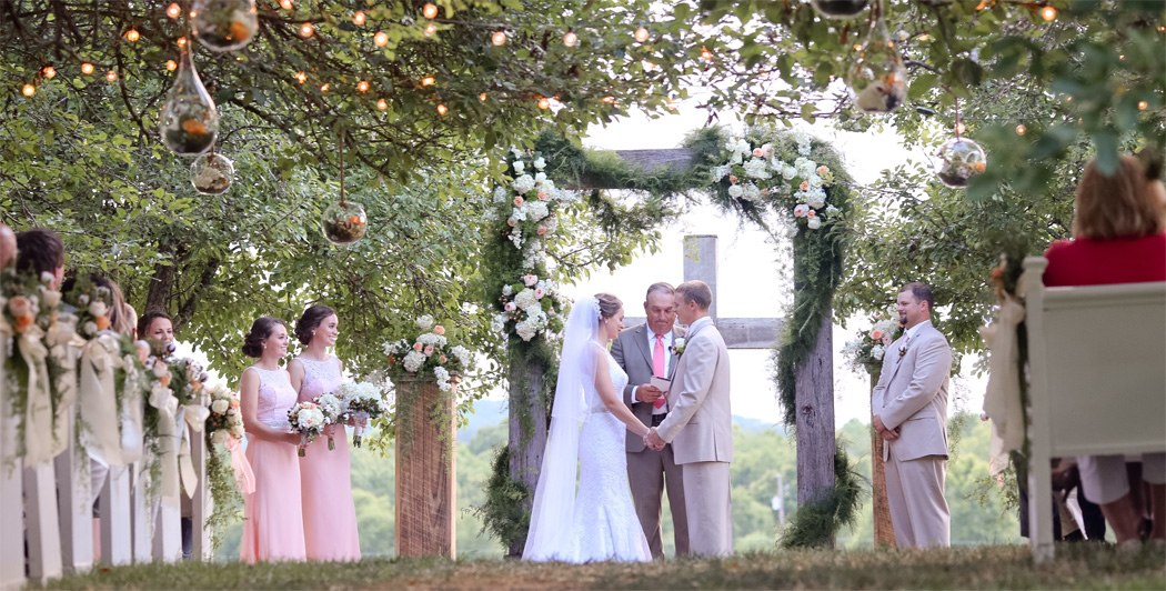 By far the most popular spot on the property for ceremonies is our grove of vintage apple trees. It truly is the perfect location for a late afternoon or sunset service. The low, gracefully arching limbs creates a natural arch that seems to envelope the couple. Dappled afternoon sunlight through the trees also creates a dreamy, almost ethereal effect that is simply stunning in person and in photographs. Shown in many of the photos below are our set of 16 antique whitewashed church pews. (all images by J&D farms)